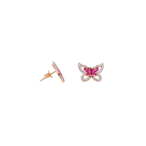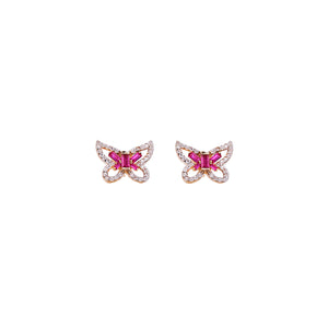 Aretes de poste en forma de mariposa e incrustación de zirconias en tono rubí y blancas.