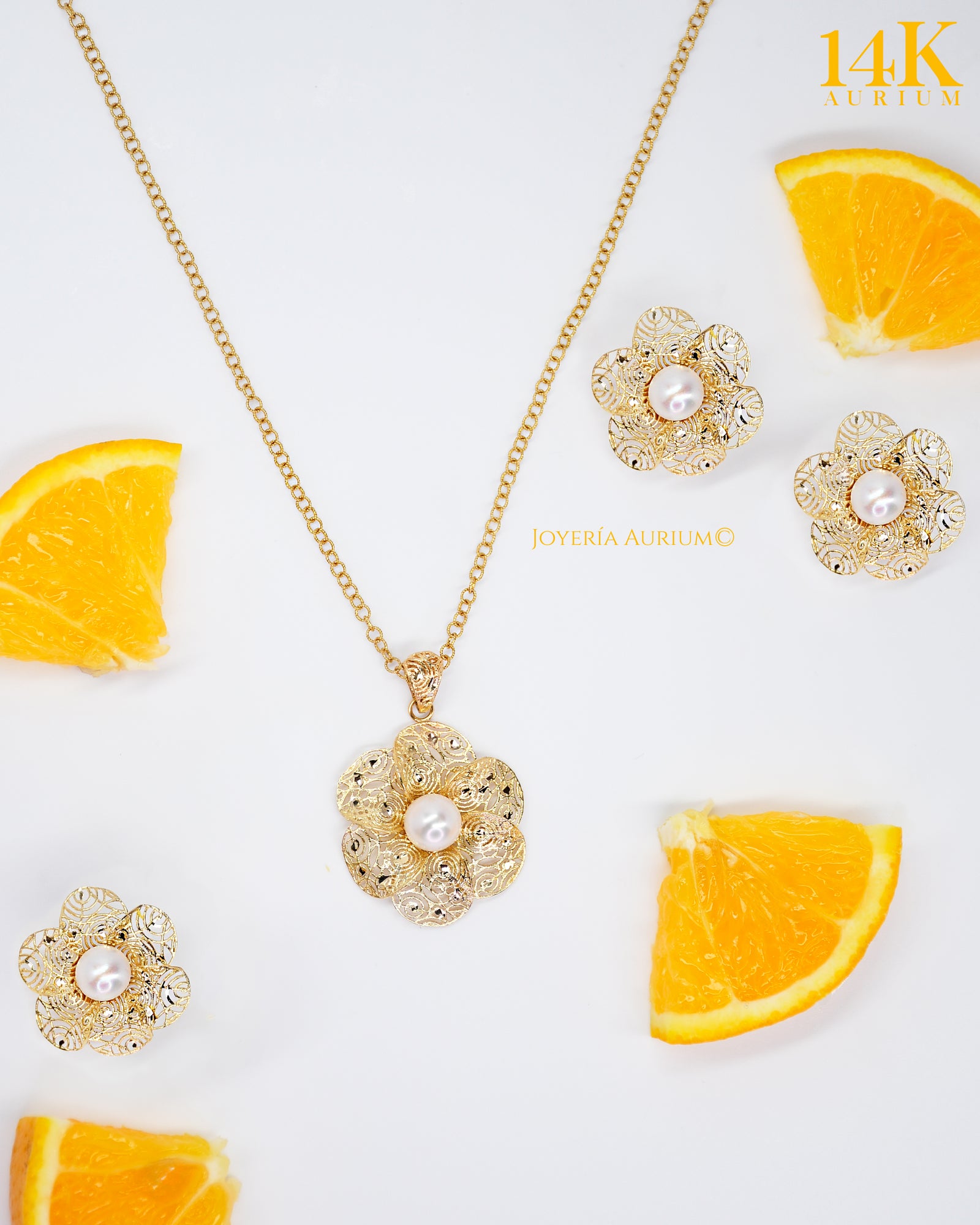 Juego de gargantilla, aretes y anillo en forma de flor con perla natural.