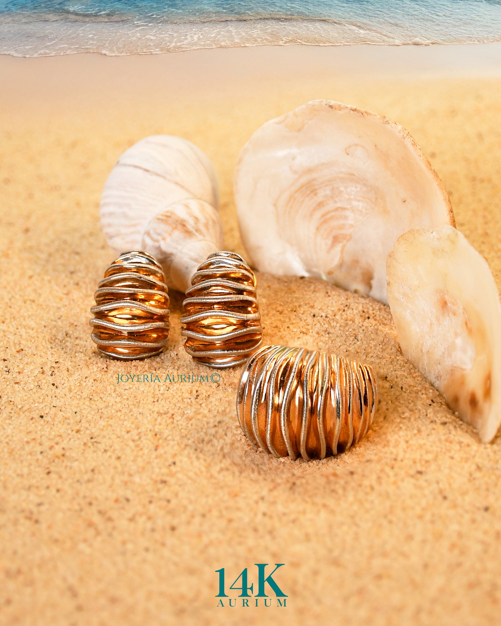Juego de aretes y anillo de caracol en oro rosa con satinado blanco.