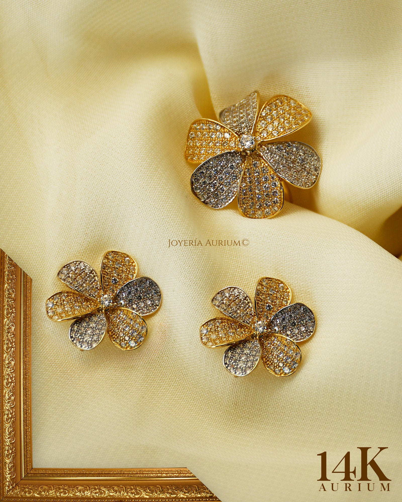 Juego de aretes y anillo en forma de flor e incrustación de zirconias dos oros.